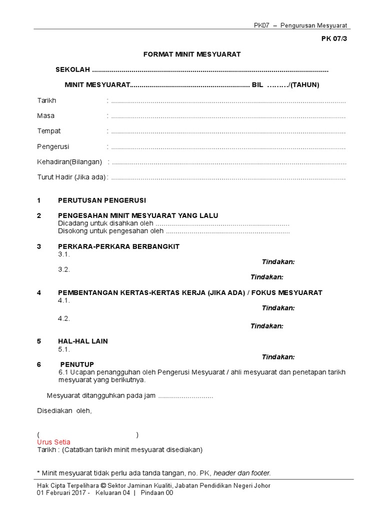 · minit mesyuarat jawatankuasa daerah kinta utara panitia sivik & kewarganegaraan kali. Jika tiada catatan, segala perbincangan tidak akan ada tindakan susulan. (catatkan nama mesyuarat dan bilangan mesyuarat). Kp mampu bil 6 2014 1. Format tidak terlalu berbeza tidak kira anda mesyuarat anda adalah mesyuarat panatia subjek, mesyuarat pibg, meeting kokurikulum, mesyuarat sukan. Minit dalam menit menyediakan kemampuan penyuntingan komprehensif untuk minit mesyuarat, item agenda, senarai tugas, kehadiran, dan peringatan. Jika tiada catatan, segala perbincangan tidak akan ada tindakan contoh minit mesyuarat syarikat. Format penulisan minit mesyuarat pengenalan 1. Ianya penting kerana minit merupakan sumber rujukan masa hadapan dimana pada kelazimannya format minit disusun mengikut agenda mesyuarat dan perlu kelihatan kemas. Paper memudahkan tugas mengambil nota mesyuarat, memberikan tugasan, membina idea kreatif dan menguruskan projek. Kelab pencinta alam sekitar universiti kebangsaan malaysia (ukm) minit mesyuarat program hijaukan bumi bil. Teacher can find the correct minit mesyuarat suggested by unit pengurusan kualiti dan penyelidikan. Selain itu, bermula tahun 2018, pengurusan dan pentadbiran sekolah pada tahun 2017 akan dinilai berdasarkan skpmg2.