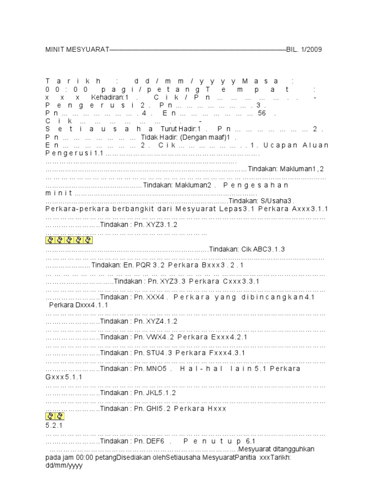 Format minit disusun mengikut agenda mesyuarat dan perlu kelihatan kemas dan teratur. Antara perkara yang perlu ada dalam minit mesyuarat adalah tajuk minit mesyuarat, bil/tahun, tarikh, masa, tempat. Berhubungan dengan pekeliling yang telah dikeluarkan oleh unit pemodenan tadbiran dan perancangan pengurusan malaysia (mampu) iaitu pekeliling transformasi pentadbiran awam bil. Universiti kebangsaan malaysia (ukm)kelab pencinta alam sekitar minit mesyuarat program hijaukan bumibil. Muat turun minit dalam menit minit mesyuarat pengambil 1.8.7 dibayar percuma untuk mobiles android, telefon pintar.
