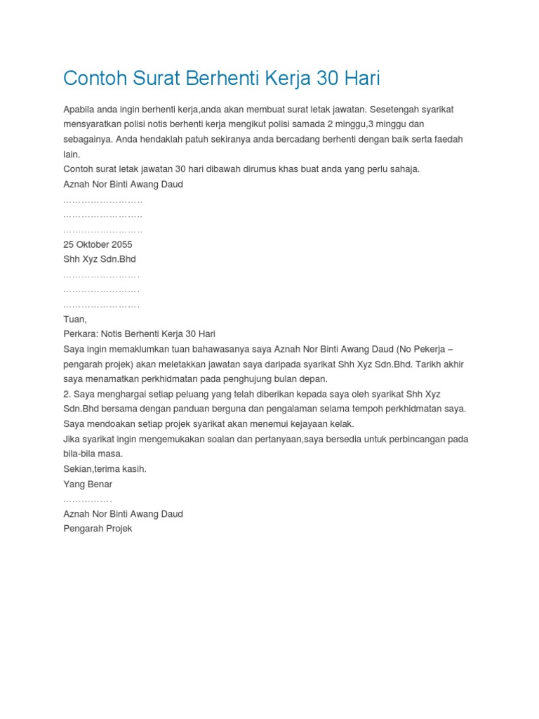 Muhammad saiful bin ahmad fuad no 12, kg tebuk, sungai rambai 3. Contoh surat berhenti kerja 1 bulan (bahasa inggeris). Contoh notis berhenti kerja di bawah ini adalah sama sahaja formatnya seperti surat berhenti kerja yang lain. Ini adalah 4 contoh surat berhenti kerja: Diharapkan pihak tuan dapat mempertimbangkan notis saya ini dan segala jasa baik dan kerjasama dari pihak tuan sepanjang saya berkhidmat di sini amatlah dihargai.