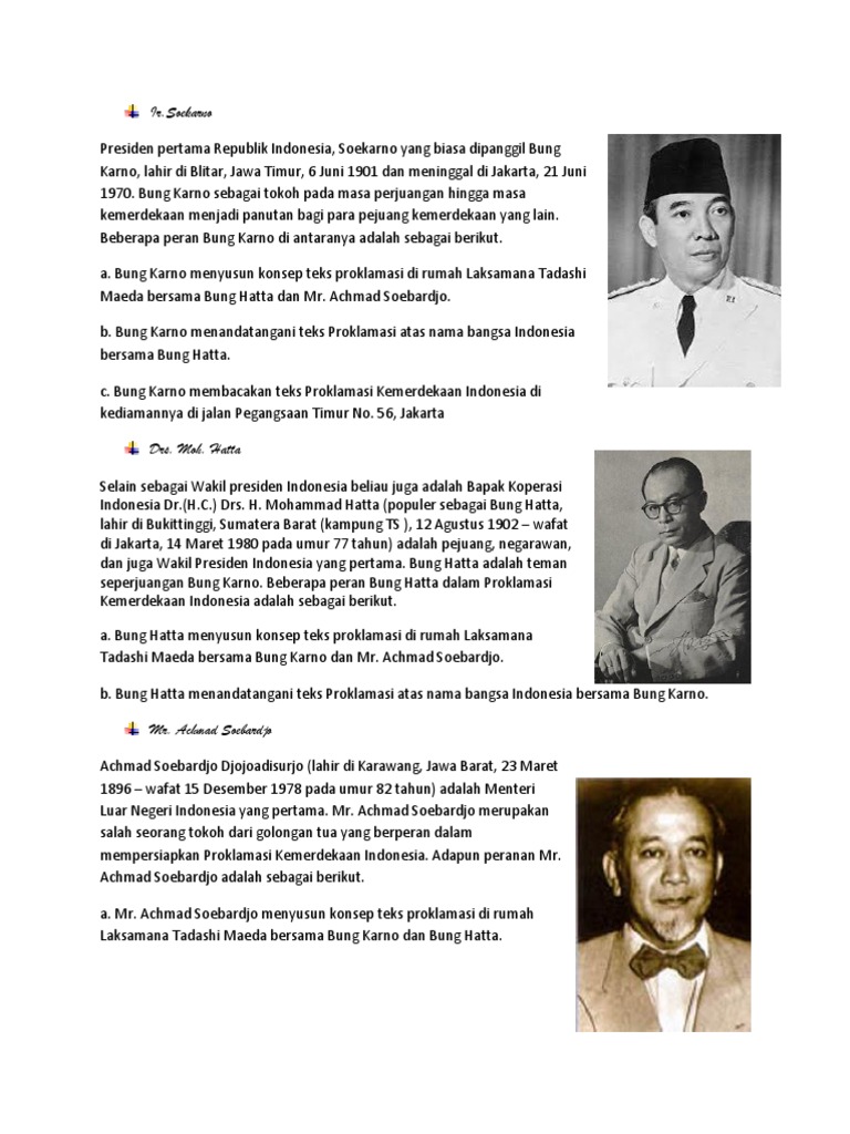 Ia adalah proklamator kemerdekaan indonesia (bersama dengan mohammad hatta) yang terjadi pada tanggal 17 agustus 1945. Kita tahu bahwa bangsa yang besar adalah bangsa menghargai jasa para pahlawan nah. Lantas, siapa saja tokoh proklamasi dalam kemerdekaan indonesia? Laksamana muda maeda memiliki peran yang cukup penting dalam kemerdekaan indonesia dengah mempersilakan kediamannya yang berada di jl. Daftar lengkap tokoh penting sumpah pemuda serta foto dan perannya.